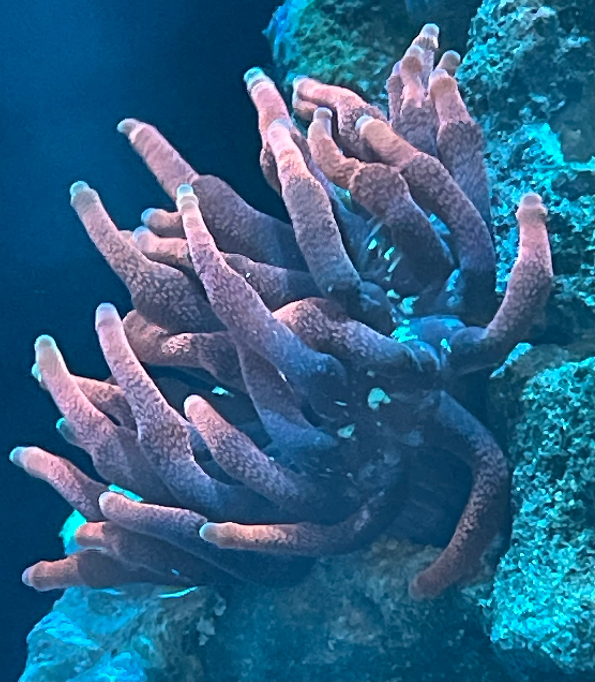 Black Widow Anemones are comprised of calcite. The red tentacles and black-blue center of the Black Widow is highly sought after in the reefing community. Anemones tend to move around the tank using their "foot" to get to a more desirable location before remaining in place. They are an aggressive coral that typically enjoys higher lighting and medium flow.