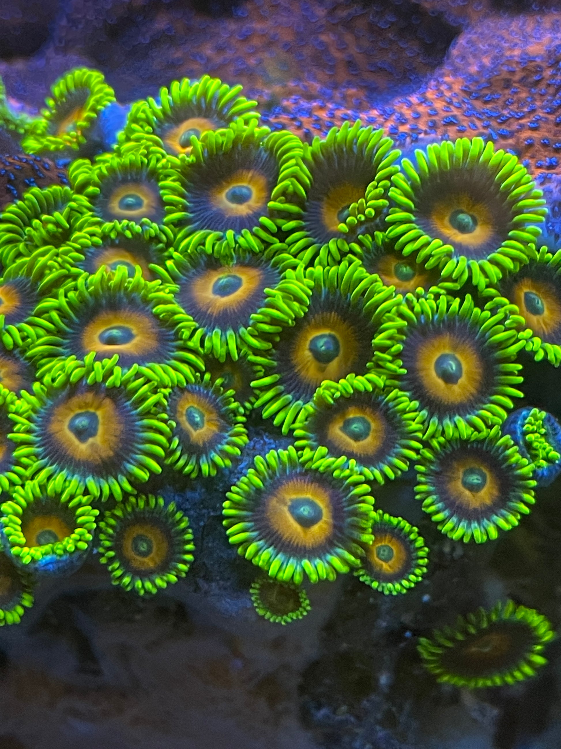 This beautiful Eagle Eye Zoanthid comes with 3+ polyps per frag! This Zoanthid has incredible size and coloration.
