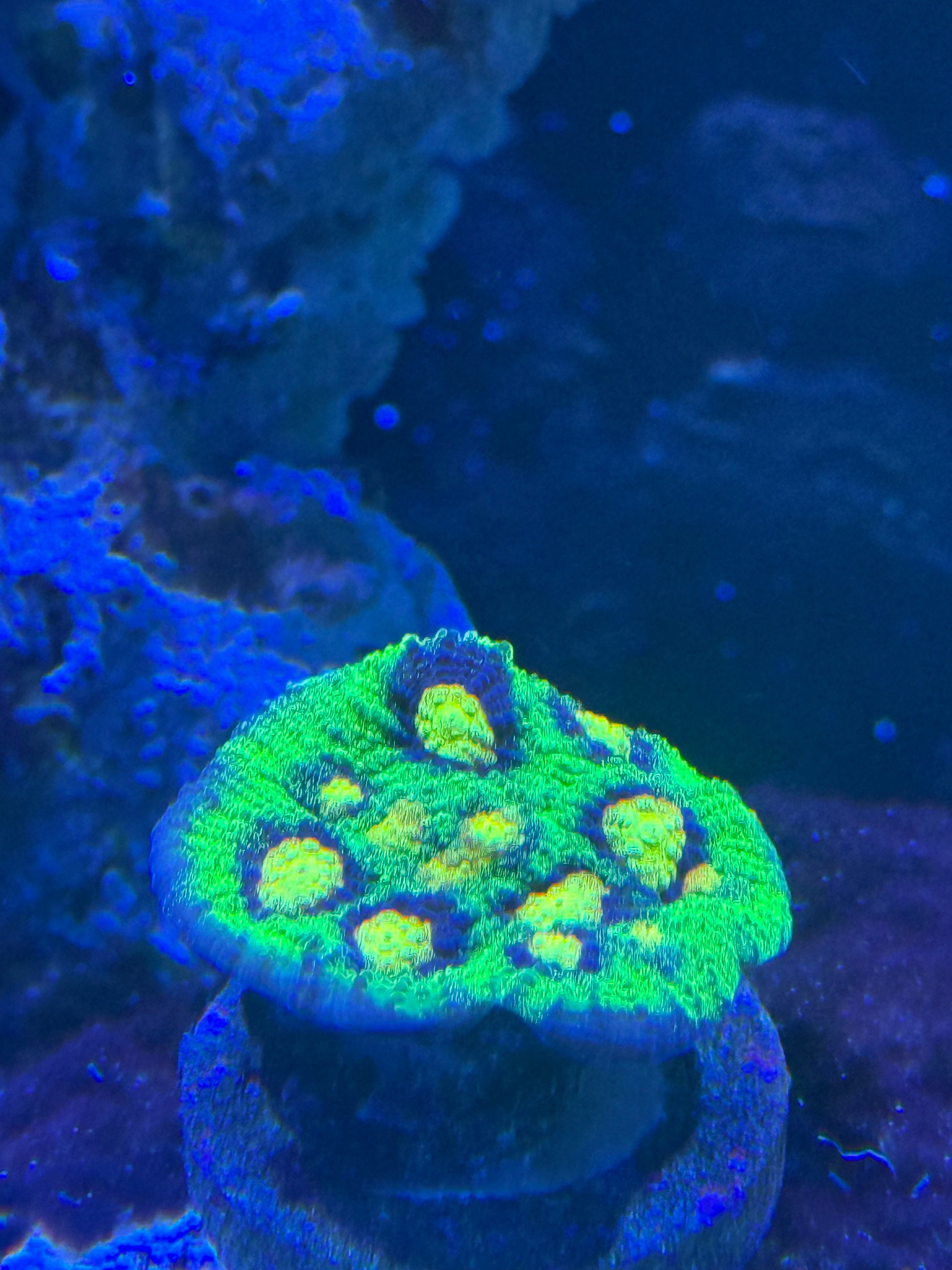 This stunning Chalice has been popular amongst hobbyists in recent years. With large yellow eyes and green base it is close in relation to the Space Invader Chalice. This Chalice enjoys lower light and medium flow.