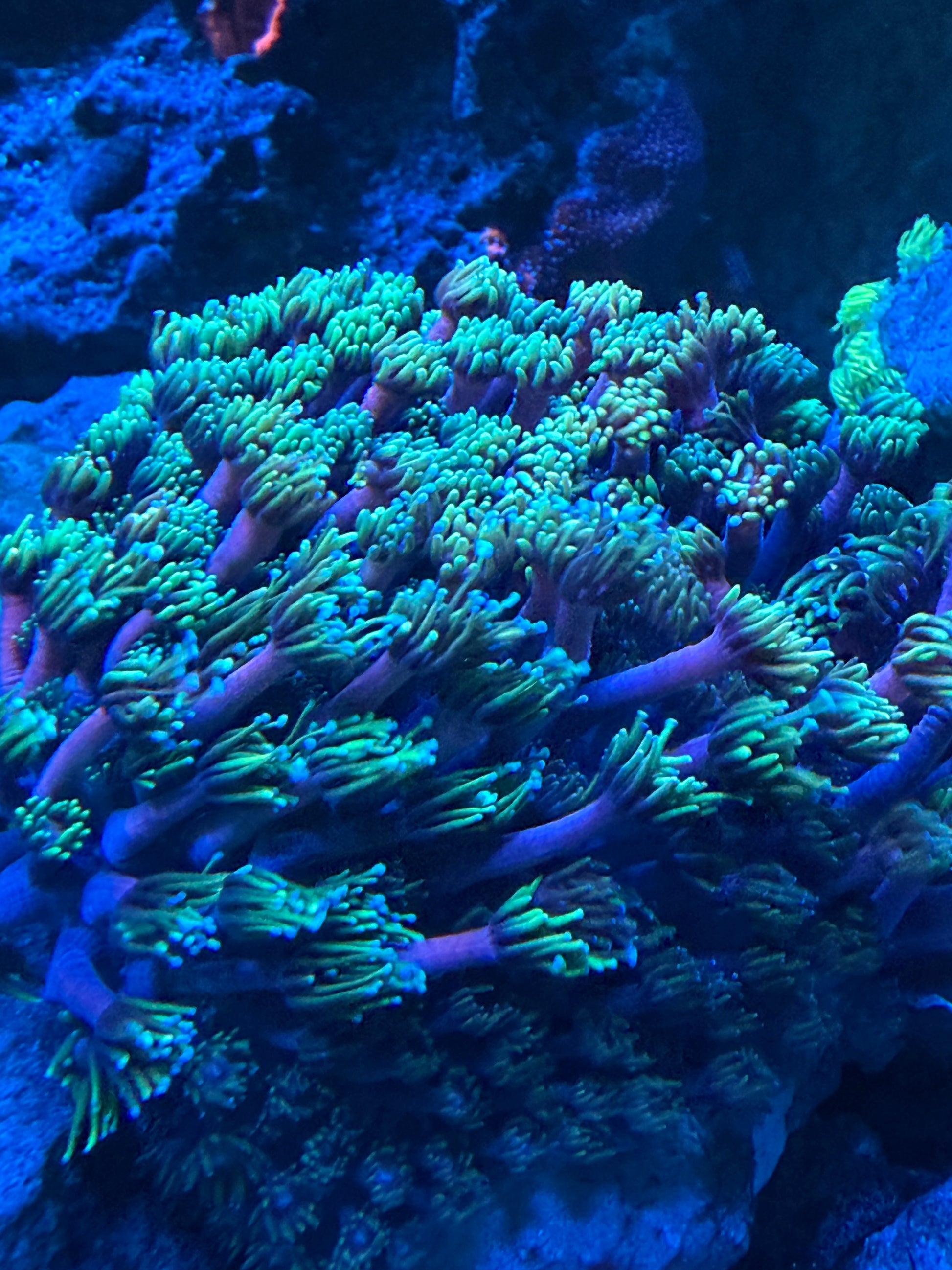 This purple and green Goniopora enjoys 75-150 par typically residing on the lower side of your reef tank. Ensure you have space for this long tentacle species. Goniopora is and LPS coral that thrives in moderate flow.