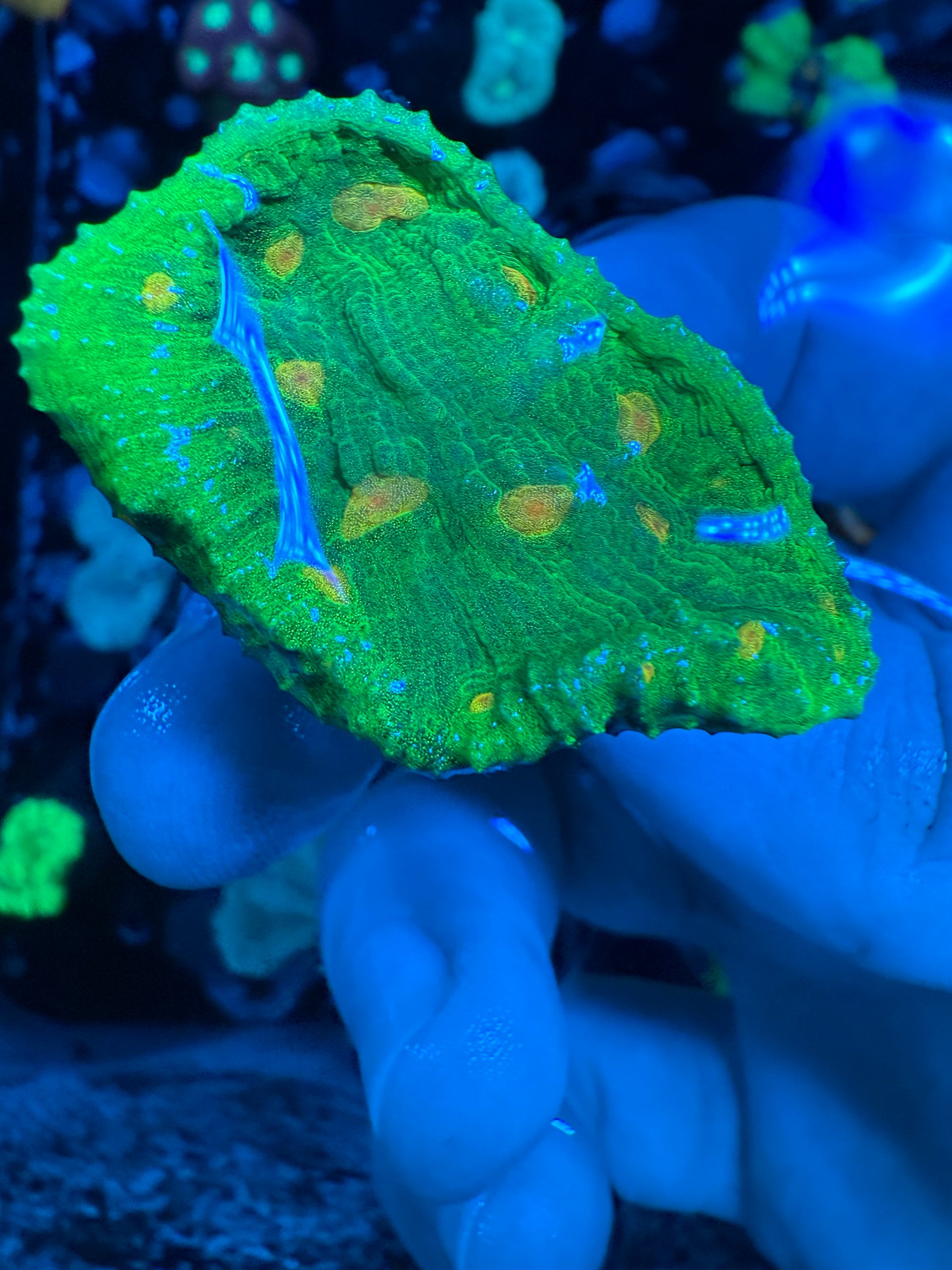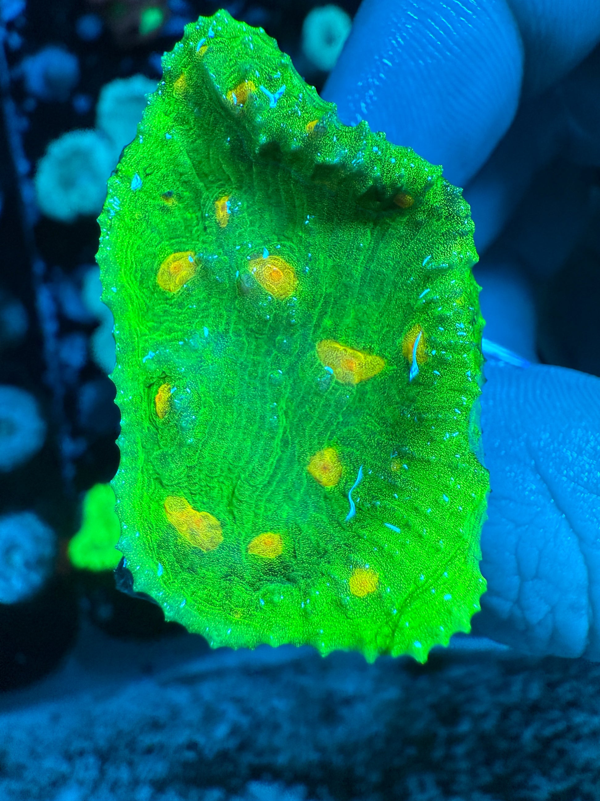 The Space Invader Chalice has a bright green base with more vibrant yellow eyes. This LPS coral is very bright and fast growing with a plating similar to montipora.