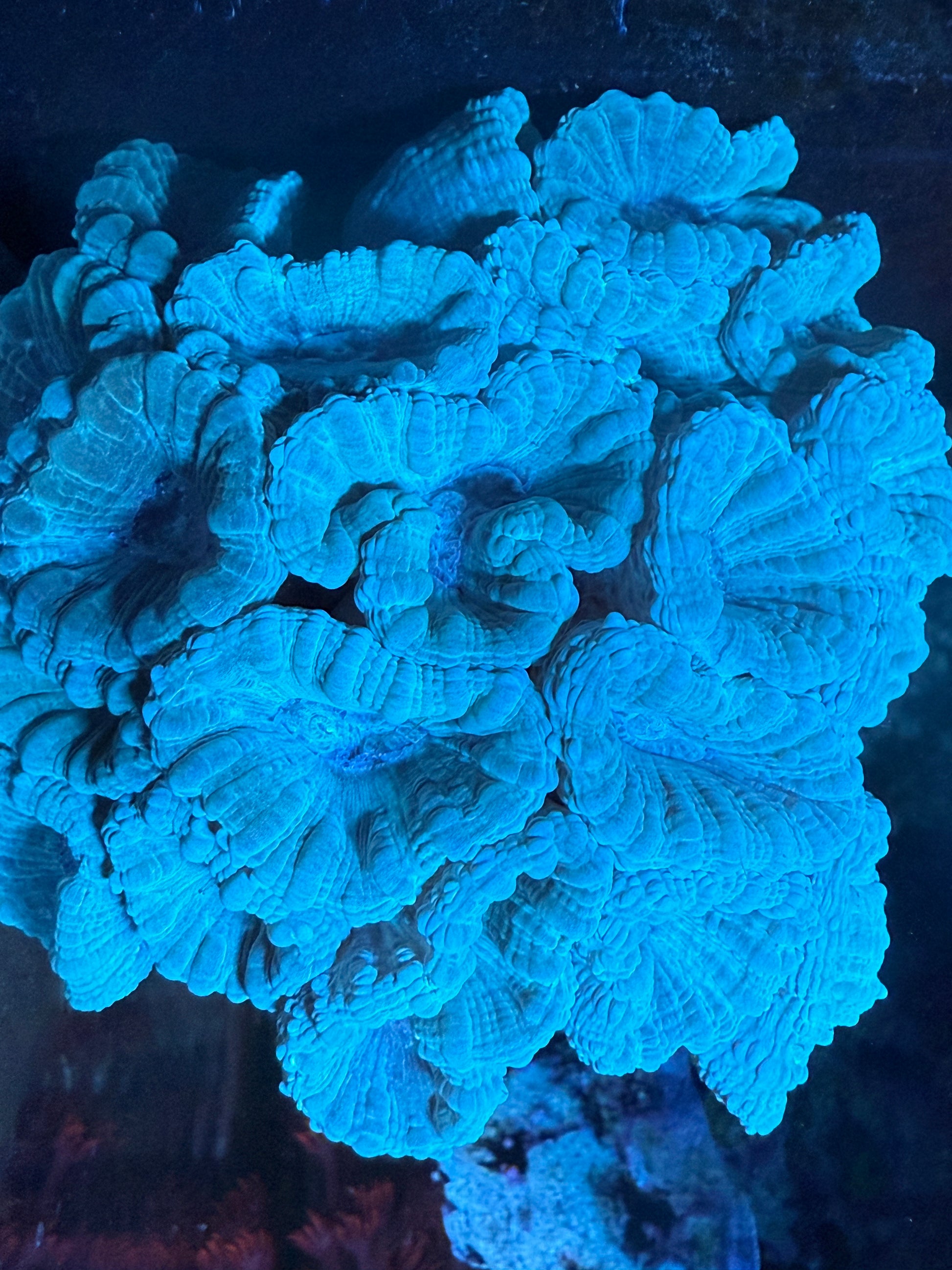 This Teal Candy Cane coral has a beautiful blue extension. It likes medium flow and lighting. For larger colonies send us an email!
